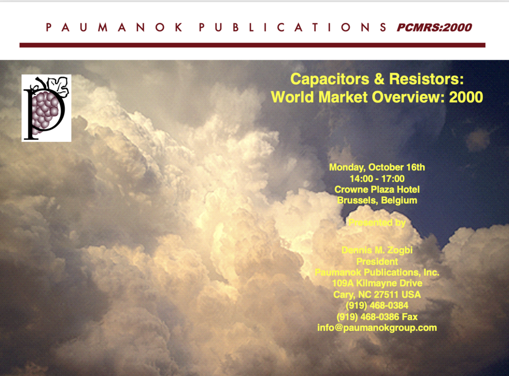 This is the 150 slide presentation from The Capacitor and Resistor Technology Symposium delivered by Paumanok IMR CEO Dennis Zogbi in Brussels Belgium in 2000. The presentation is a detailed documentation of value, volume, pricing, market shares and consumption by end-use market segment and region for that crucial year in high-tech. 150 Slides in PDF Format.
