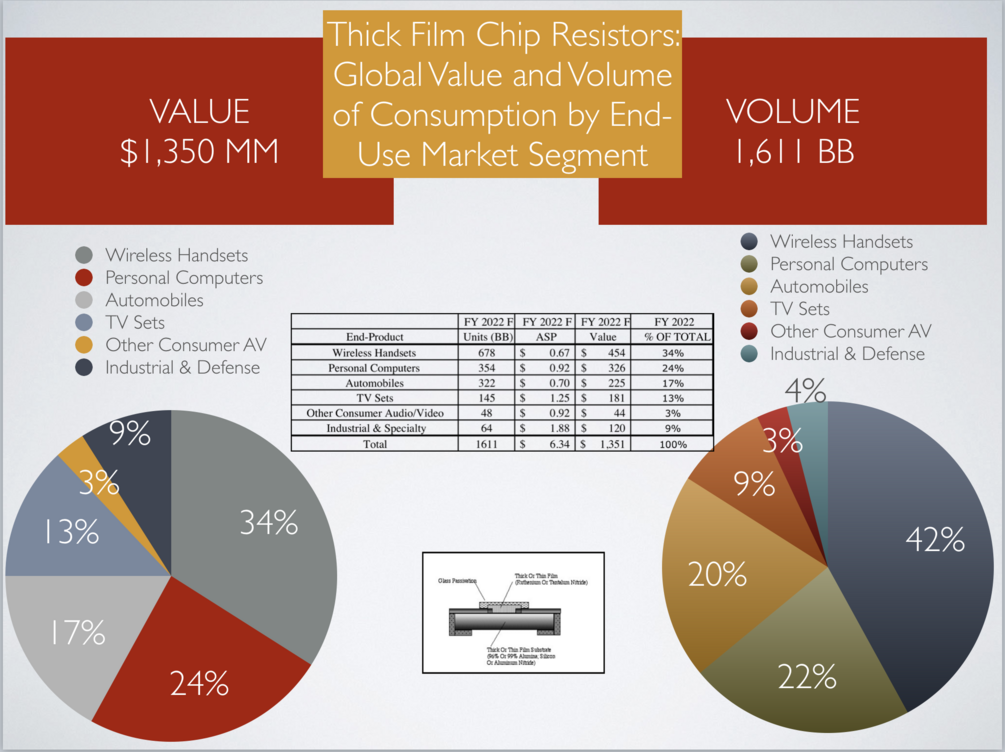 This study is a detailed analysis of the thick film chip resistor supply chain from raw material ores, engineered materials, substrates and pastes, unit output, economies of scale, detailed market shares throughout the supply chain and consumption in key end markets and specific products within those markets driving demand, regional consumption and also addresses changes in thick film resistor technology.