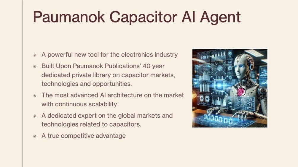 The Paumanok AI Agent for Capacitors offers a detailed understanding of the growth in demand for capacitors for applications in computers and solid-state disc drives; telecommunications infrastructure and networking; automotive electronics, including internal combustion engine Safety and electric vehicle propulsion; industrial power electronics; consumer audio and video imaging; wireless handsets; and a detailed focus on high-reliability end markets - with an analysis of recent consumption and forecasts for capacitor consumption.
